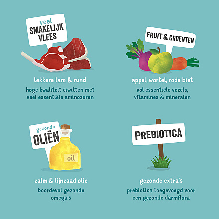 Samenstelling: lam 30%, rund 30%, wortel 2%, mineralen, mannan-oligosachariden (MOS), broccoli (gedroogd) 0,25%, rode bieten (gedroogd) 0,25%, lijnzaadolie, fructo-oligosachariden (FOS), zalmolie, appels (gedroogd) 0,06%, peer (gedroogd) 0,05%, banaan (gedroogd) 0,05%, bosbessen (gedroogd) 0,05%, gedroogde venkel 0,01%, gedroogd karwijzaad 0,01%, gedroogd duizendblad 0,01%, gedroogde braambessenblaadjes 0,01%, gedroogde maretak 0,01%, gedroogde kamillebloesem 0,01%, gedroogde gentiaanwortel 0,01%, gedroogd duizendguldenkruid 0,01%