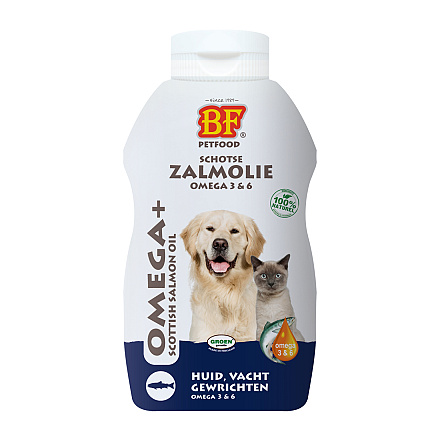 BF Petfood Zalmolie wordt koudgeperst uit verse Pacificische zalm, is rijk aan omega 3 en 6-vetzuren en bevat optimale EPA/DHA waarden. Biofood zalmolie is gunstig voor hart en bloedvaten, ondersteunt gewrichten, huid (bijv. haaruitval, jeuk, vlooien allergie en kale plekken), vacht (bij bijv. doffe vacht), vertering (voedselopname) en zorgt voor verlaging pH waarde urine (ivm blaasgruis). Hoog geconcentreerd pure zalmolie en dus zuinig in gebruik en niet vermengd met andere (goedkopere) visolie. Voor alle honden- en kattenrassen.
