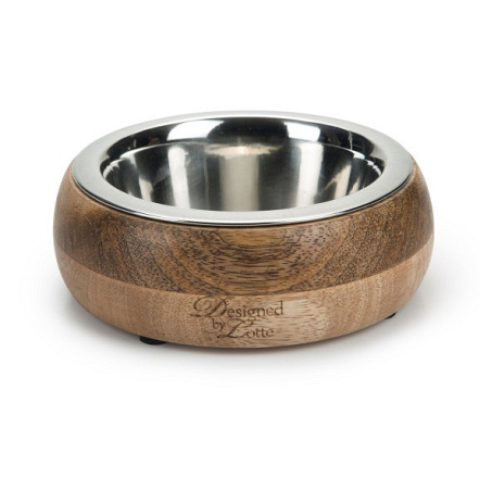 Houten voerbak met uitneembaar rvs bakje. Het bakje is vaatwasserbestendig.