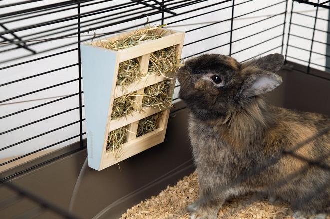 Je knaagdier trekt de plukken hooi zelf uit de hooiruif, zodat hij er lekker op kan knabbelen. Door het gebruikte hout en trendy pastelkleuren ziet de Beeztees hooiruif Rima er ook nog eens heel erg leuk uit.